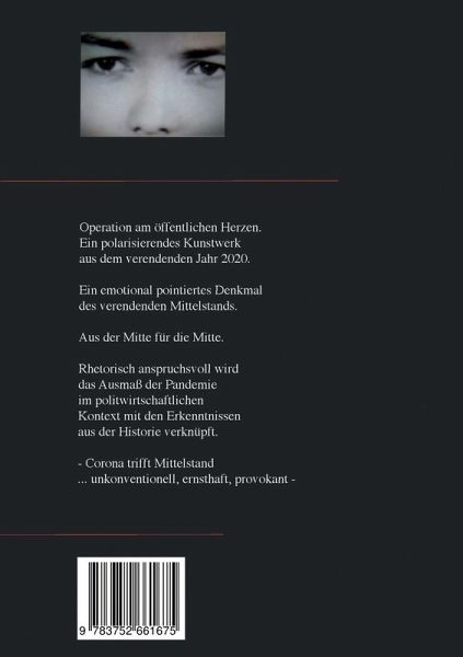 Operation Corona. Operation am öffentlichen Herzen. Ein polarisierendes Kunstwerk aus dem verendenden Jahr 2020. Ein emotional pointiertes Denkmal des verendenden Mittelstands. Aus der Mitte für die Mitte. Rhetorisch anspruchsvoll wird das Ausmaß der Pandemie im politwirtschaftlichen Kontext mit den Erkenntnissen aus der Historie verknüpft.- Corona trifft Mittelstand ... unkonventionell, ernsthaft, provokant -
