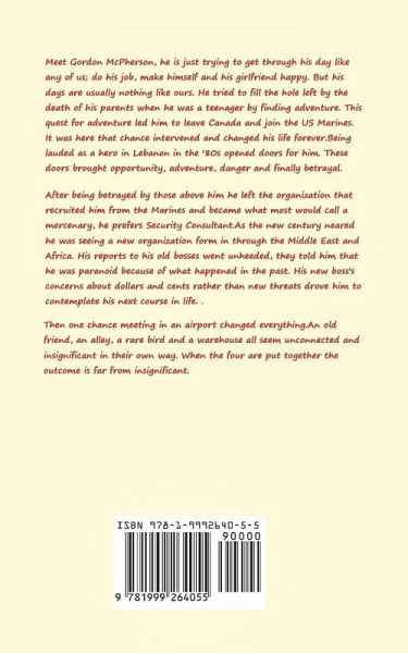 Meet Gordon McPherson, he is just trying to get through his day like any of us; do his job, make himself and his girlfriend happy. But his days are usually nothing like ours. He tried to fill the hole left by the death of his parents when he was a teenager by finding adventure. This quest for adventure led him to leave Canada and join the US Marines. It was here that chance intervened and changed his life forever. Being lauded as a hero in Lebanon in the '80s opened doors for him. These doors brought opportunity, adventure, danger and finally betrayal. After being betrayed by those above him he left the organization that recruited him from the Marines and became what most would call a mercenary, he prefers Security Consultant. As the new century neared he was seeing a new organization form in through the Middle East and Africa. His reports to his old bosses went unheeded, they told him that he was paranoid because of what happened in the past. His new boss's concerns about dollars and cents rather than new threats drove him to contemplate his next course in life. Then one chance meeting in an airport changed everything. An old friend, an alley, a rare bird and a warehouse all seem unconnected and insignificant in their own way. When the four are put together the outcome is far from insignificant.