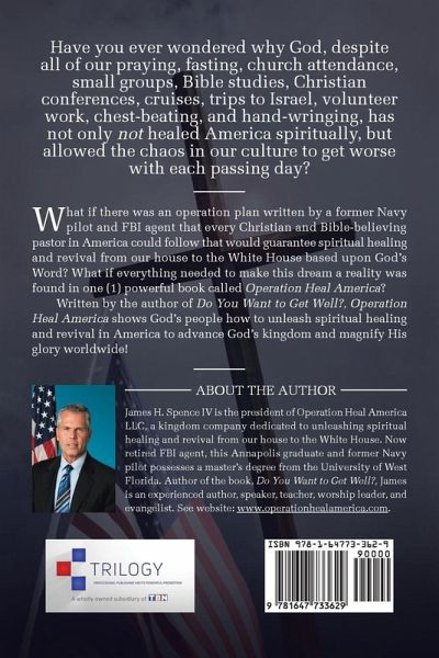 Have you ever wondered why God, despite all of our praying, fasting, church attendance, small groups, Bible studies, Christian conferences, cruises, trips to Israel, volunteer work, chest-beating, and hand-wringing, has not only not healed America spiritually, but allowed the chaos in our culture to get worse with each passing day? What if there was an operation plan written by a former Navy pilot and FBI agent that every Christian and Bible-believing pastor in America could follow that would guarantee spiritual healing and revival from our house to the White House based upon God’s Word? What if everything needed to make this dream a reality was found in one (1) powerful book called Operation Heal America? Written by the author of Do You Want to Get Well?, Operation Heal America shows God’s people how to unleash spiritual healing and revival in America to advance God’s kingdom and magnify His glory worldwide!