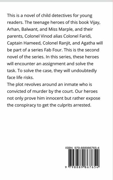 This is a novel of child detectives for young readers. The teenage heroes of this book Vijay, Arhan, Balwant, and Miss Marple, and their parents, Colonel Vinod alias Colonel Faridi, Captain Hameed, Colonel Ranjit, and Agatha will be part of a series Fab Four. This is the second novel of the series. In this series, these heroes will encounter an assignment and solve the task. To solve the case, they will undoubtedly face life risks. The plot revolves around an inmate who was convicted of murder by the court. Our heroes not only prove him innocent but rather expose the conspiracy to get the culprits arrested.