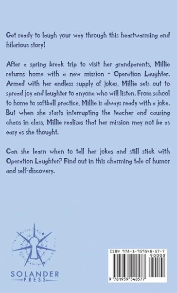 Get ready to laugh your way through this heartwarming and hilarious story! After a spring break trip to visit her grandparents, Millie returns home with a new mission - Operation Laughter. Armed with her endless supply of jokes, Millie sets out to spread joy and laughter to anyone who will listen. From school to home to softball practice, Millie is always ready with a joke. But when she starts interrupting the teacher and causing chaos in class, Millie realizes that her mission may not be as easy as she thought. Can she learn when to tell her jokes and still stick with Operation Laughter? Find out in this charming tale of humor and self-discovery.