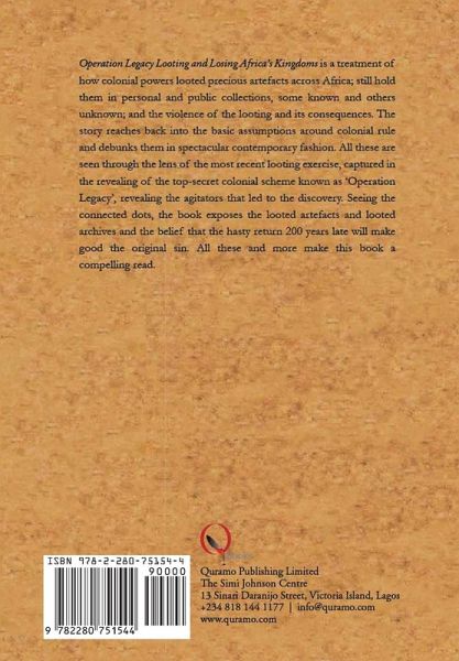 Operation Legacy Looting and Losing Africa's Kingdoms is a treatment of how colonial powers looted precious artefacts across Africa; still hold them in personal and public collections, some known and others unknown; and the violence of the looting and its consequences. The story reaches back into the basic assumptions around colonial rule and debunks them in spectacular contemporary fashion. All these are seen through the lens of the most recent looting exercise, captured in the revealing of the top-secret colonial scheme known as 'Operation Legacy', revealing the agitators that led to the discovery. Seeing the connected dots, the book exposes the looted artifact. and looted archives and the belief that the hasty return 200 years late will make good the original sin. All these and more make this book a compelling read.