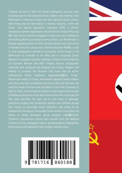 Towards the end of 1943, the British Intelligence services were receiving reports that captured Soviet soldiers were fighting in the Wehrmacht in Western Europe and that captured Soviet citizens were being used as slave labour in German factories, mines and farms. The Special Operations Executive (SOE), a British clandestine warfare organisation, like the British Foreign Office and MI6, had Country Sections engaged in collecting such intelligence and making plans to counteract enemy activity. Len Manderstam, a Russian-speaking officer of SOE's Russian Section who had served in the Red Army as a young man, devised Operation MAMBA, a plan to drop propaganda materials to encourage Soviet troops in the Wehrmacht to surrender to the Allies and to encourage Soviet labourers to engage in passive sabotage. In liaison with the Ministry of Economic Warfare and SOE's Forgery Section, propaganda materials were produced and dropped into France, Belgium and Holland to convince the Germans that there was an active underground Soviet resistance organisation. After D-Day, Manderstam went to France, interviewed captured Soviet soldiers and those who had surrendered and learned how the Germans had used the threat of torture and starvation to force their prisoners to fight for them. He developed a scheme to interrogate those brought to Britain as prisoners of war and recruit those who convinced him they were anti-Nazi. His plan was to train them in sabotage, parachute jumping and clandestine warfare and infiltrate groups into France to encourage Soviet defection, and others to be dropped into Germany to encourage Soviet workers to 'go slow' and others to attack Germany's secret weapons sites. As the Soviet Union was Britain's ally and there was a secret agreement between the NKVD, the People's Commissariat for Internal Affairs, they were invited to participate in Operation MAMBA. However, as Stalin had ordered Soviet soldiers to fight to the death and any who were captured were considered traitors, the NKVD refused to collaborate and raised their objections with the British Foreign Office. Bernard O'Connor's documentary history uses primary sources including letters, memoranda, telegrams and reports found in SOE files in the National Archives and secondary sources including autobiographies and biographies, newspaper articles and web pages to shed light through a British filter on this little-known operation.