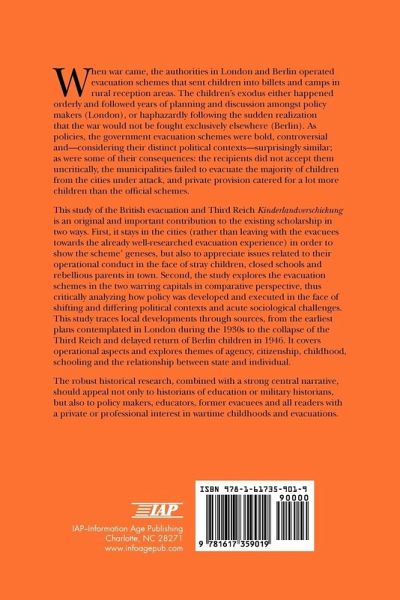 When war came, the authorities in London and Berlin operated evacuation schemes that sent children into billets and camps in rural reception areas. The children's exodus either happened orderly and followed years of planning and discussion amongst policy makers (London), or haphazardly following the sudden realization that the war would not be fought exclusively elsewhere (Berlin). As policies, the government evacuation schemes were bold, controversial and - considering their distinct political contexts - surprisingly similar; as were some of their consequences: the recipients did not accept them uncritically, the municipalities failed to evacuate the majority of children from the cities under attack, and private provision catered for a lot more children than the official schemes. This study of the British evacuation and Third Reich Kinderlandverschickung is an original and important contribution to the existing scholarship in two ways. First, it stays in the cities (rather than leaving with the evacuees towards the already well-researched evacuation experience) in order to show the scheme' geneses, but also to appreciate issues related to their operational conduct in the face of stray children, closed schools and rebellious parents in town. Second, the study explores the evacuation schemes in the two warring capitals in comparative perspective, thus critically analyzing how policy was developed and executed in the face of shifting and differing political contexts and acute sociological challenges. This study traces local developments through sources, from the earliest plans contemplated in London during the 1930s to the collapse of the Third Reich and delayed return of Berlin children in 1946. It covers operational aspects and explores themes of agency, citizenship, childhood, schooling and the relationship between state and individual. The robust historical research, combined with a strong central narrative, should appeal not only to historians of education or military historians, but also to policy makers, educators, former evacuees and all readers with a private or professional interest in wartime childhoods and evacuations.