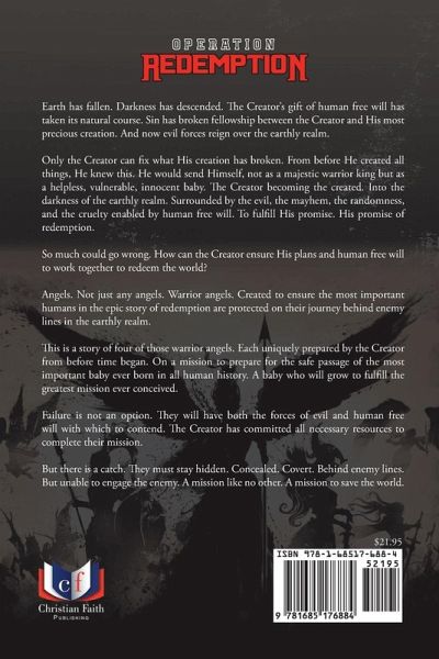 Earth has fallen. Darkness has descended. The Creator's gift of human free will has taken its natural course. Sin has broken fellowship between the Creator and His most precious creation. And now evil forces reign over the earthly realm. Only the Creator can fix what His creation has broken. From before He created all things, He knew this. He would send Himself, not as a majestic warrior king but as a helpless, vulnerable, innocent baby. The Creator becoming the created. Into the darkness of the earthly realm. Surrounded by the evil, the mayhem, the randomness, and the cruelty enabled by human free will. To fulfill His promise. His promise of redemption. So much could go wrong. How can the Creator ensure His plans and human free will to work together to redeem the world? Angels. Not just any angels. Warrior angels. Created to ensure the most important humans in the epic story of redemption are protected on their journey behind enemy lines in the earthly realm. This is a story of four of those warrior angels. Each uniquely prepared by the Creator from before time began. On a mission to prepare for the safe passage of the most important baby ever born in all human history. A baby who will grow to fulfill the greatest mission ever conceived. Failure is not an option. They will have both the forces of evil and human free will with which to contend. The Creator has committed all necessary resources to complete their mission. But there is a catch. They must stay hidden. Concealed. Covert. Behind enemy lines. But unable to engage the enemy. A mission like no other. A mission to save the world.