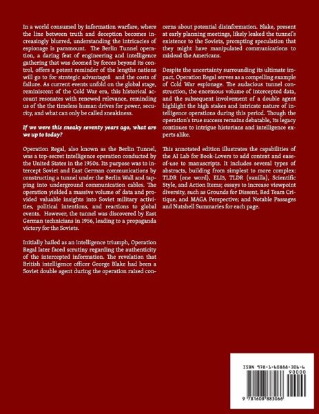 In a world consumed by information warfare, where the line between truth and deception becomes increasingly blurred, understanding the intricacies of espionage is paramount.The Berlin Tunnel operation, a daring feat of engineering and intelligence gathering that was doomed by forces beyond its control, offers a potent reminder of the lengths nations will go to for strategic advantage-and the costs of failure. As current events unfold on the global stage, reminiscent of the Cold War era, this historical account resonates with renewed relevance, reminding us of the the timeless human drives for power, security, and what can only be called sneakiness. If we were this sneaky seventy years ago, what are we up to today? NSA report, originally classified TOP SECRET: UMBRA. Operation Regal, also known as the Berlin Tunnel, was a top-secret intelligence operation conducted by the United States in the 1950s. Its purpose was to intercept Soviet and East German communications by constructing a tunnel under the Berlin Wall and tapping into underground communication cables. The operation yielded a massive volume of data and provided valuable insights into Soviet military activities, political intentions, and reactions to global events.However, the tunnel was discovered by East German technicians in 1956, leading to a propaganda victory for the Soviets. Initially hailed as an intelligence triumph, Operation Regal later faced scrutiny regarding the authenticity of the intercepted information. The revelation that British intelligence officer George Blake had been a Soviet double agent during the operation raised concerns about potential disinformation. Blake, present at early planning meetings, likely leaked the tunnel's existence to the Soviets, prompting speculation that they might have manipulated communications to mislead the Americans. Despite the uncertainty surrounding its ultimate impact, Operation Regal serves as a compelling example of Cold War espionage. The audacious tunnel construction, the enormous volume of intercepted data, and the subsequent involvement of a double agent highlight the high stakes and intricate nature of intelligence operations during this period. Though the operation's true success remains debatable, its legacy continues to intrigue historians and intelligence experts alike. This annotated edition illustrates the capabilities of the AI Lab for Book-Lovers to add context and ease-of-use to manuscripts. It includes several types of abstracts, building from simplest to more complex: TLDR (one word), ELI5, TLDR (vanilla), Scientific Style, and Action Items; essays to increase viewpoint diversity, such as Grounds for Dissent, Red Team Critique, and MAGA Perspective; and Notable Passages and Nutshell Summaries for each page. Published May 10, 2024--seventy-nine years to the day after starting the tunnel.