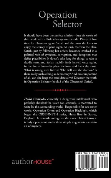 It should have been the perfect missionjust six weeks of shift work with a little sabotage on the side. Plenty of free time for Phantom agent Satiah and the man she loves to enjoy the secrecy of plain sight. At least, that was the plan. Satiah, just by following her orders, becomes involved in a political web of cynicism, corruption, and deception that defies plausibility. It doesnt take long for things to take a deadly turn, and Satiah rapidly finds herself, once again, in the line of firethe place she loves and hates the most. What is wrong with Kelvin? Who will win the election? Is there really such a thing as democracy? And most important of all, can she keep the candidate alive? Discover the truth in Operation Selector (book 3 of the Obsenneth Series).