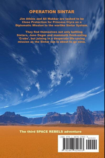 Jim Atkins and Ali Mukbar are tasked to be Close Protection for Princess Clyra on a Diplomatic Mission to the warlike Sintar System. They find themselves not only battling Sintars, Jano Dagar and mammoth flesh-eating 'Crabs', but joining in a desperate life-saving mission as the Sintar sun is about to go nova. (The third SPACE REBELS adventure: Space Rebels; Warriors of Kharlor; Operation Sintar).