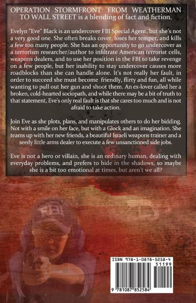 OPERATION STORMFRONT: FROM WEATHERMAN TO WALL STREET is a blending of fact and fiction. Eve Black is an undercover FBI Special Agent, but she's not a very good one. She often breaks cover, loses her temper, and kills a few too many people. She goes undercover as a terrorism researcher/author to infiltrate American terrorist cells, weapons dealers, and to use her position in the FBI to take revenge on a few people, but her inability to stay undercover causes more roadblocks than she can handle alone. It's not really her fault, to succeed she must become friendly, flirty and fun, all while wanting to pull out her gun and shoot them. An ex-lover called her a broken, cold-hearted sociopath, and while there may be a bit of truth to that statement, Eve's only real fault is that she cares too much and is not afraid to take action. Join Eve as she plots, plans, and manipulates others to do her bidding. Not with a smile on her face, but with a Glock and an imagination. She teams up with her new friends, a beautiful Israeli weapons trainer and a seedy little arms dealer to execute a few unsanctioned side jobs. Eve is not a hero or villain, she is an ordinary human, dealing with everyday problems, and prefers to hide in the shadows, so maybe she is a bit too emotional at times, but aren't we all?