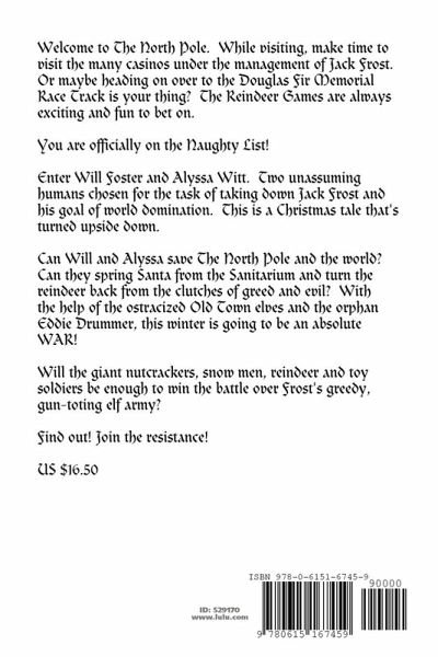 Santa is in an institution. The good elves live on food rations in Old Town. The reindeer are mentally bent. The Herald Angels are powerless to bring corruption to the forefront in their newspaper. Can two humans save the North Pole and destroy the sinner's paradise that Jack Frost built? With melted snowmen on the take, a nutcracker-toy soldier army, ostracized elves and some reindeer bent on the North Pole's restoration, join the revolution to save Christmas. Reader discretion advised. This is a Christmas tale for adults. Bad language and sexual situations, not to mention the destruction of nearly every Christmas icon that we hold dear.