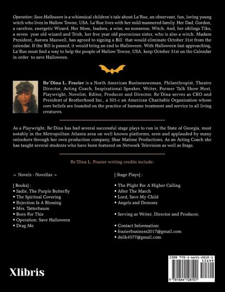 Operation: Save Halloween is a whimsical children's tale about La'Rue, an observant, fun, loving young witch who lives in Hallow Towne, USA. La'Rue lives with her mild mannered family. Her Dad, Gordon, a carefree, energetic Wizard. Her Mom, Isadora, a wise, no nonsense, Witch. And, her siblings Tiko, a seven year old wizard and Trish, her five year old precocious sister, who is also a witch. Madam President, Aurora Maxwell, has agreed to signing a Bill that would eliminate October 31st from the calendar. If the Bill is passed, it would bring an end to Halloween. With Halloween fast…mehr