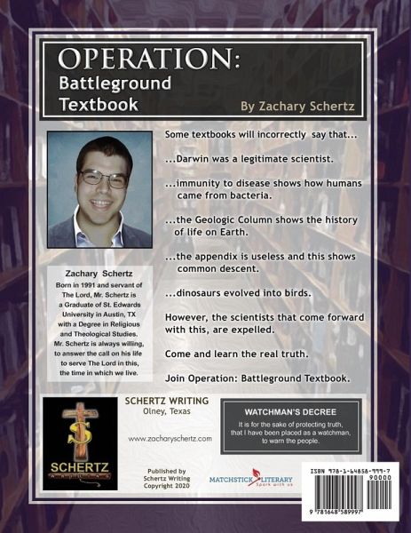 Some textbooks will incorrectly say that......Darwin was a legitimate scientist....immunity to disease shows how humans came from bacteria....the Geologic Column shows the history of life on Earth....the appendix is useless and this shows common descent....dinosaurs evolved into birds. However, the scientists that come forward with this, are expelled. Come and learn the real truth. Join Operation: Battleground Textbook.