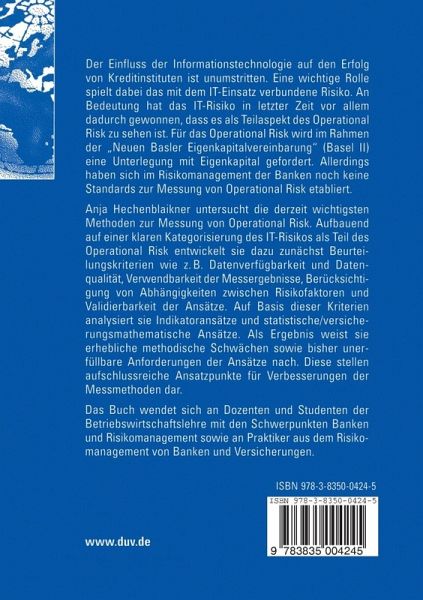 Anja Hechenblaikner untersucht die derzeit wichtigsten Methoden zur Messung von Operational Risk. Aufbauend auf einer klaren Kategorisierung des IT-Risikos als Teil des Operational Risk entwickelt sie dazu zunächst Beurteilungskriterien wie z.B. Datenverfügbarkeit und Datenqualität, Verwendbarkeit der Messergebnisse, Berücksichtigung von Abhängigkeiten zwischen Risikofaktoren und Validierbarkeit der Ansätze. Auf Basis dieser Kriterien analysiert sie Indikatoransätze und statistische/versicherungsmathematische Ansätze. Als Ergebnis weist sie erhebliche methodische Schwächen sowie bisher unerfüllbare Anforderungen der Ansätze nach. Diese stellen aufschlussreiche Ansatzpunkte für Verbesserungen der Messmethoden dar.