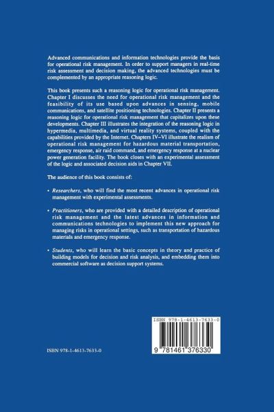 This book presents such a reasoning logic for operational risk management. Chapter 1 discusses the need for operational risk management and the feasibility of its use based upon advances in sensing, mobile communications, and satellite positioning technologies. Chapter II presents a reasoning logic for operational risk management that capitalizes upon these developments. Chapter III illustrates the integration of the reasoning logic in hypermedia, multimedia, and virtual reality systems, coupled with the capabilities provided by the Internet. Chapters IV-VI illustrate the realism of operational risk management for hazardous material transportation, emergency response, air raid command, and emergency response at a nuclear power generation facility. The book closes with an experimental assessment of the logic and associated decision aids in Chapter VII.