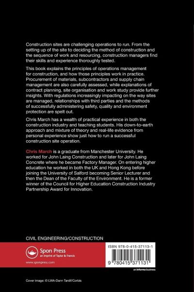 Students studying construction management and related subjects need to have a broad understanding of the major aspects of controlling the building processes. Operations Management for Construction is one of three textbooks (Business Organisation, Operations Management and Finance Control) written to systematically cover the field. Focusing on construction sites and operations which are challenging to run, Chris March explores issues such as the setting up of the site, the deciding of the methodology of construction, and the sequence of work and resourcing. As changing and increasing regulations affect the way sites are managed, he also considers the issues and methods of successful administering, safety, quality and environment. Finally, the contractor's responsibility to the environment, including relationships with third parties, selection of materials, waste management and sustainability is discussed. Chris March has a wealth of practical experience in the construction industry, as well as considerable experience of teaching, which he uses to support the theory and principles set out in the book.