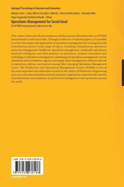 This volume showcases the presentations and discussions delivered at the 2018 POMS International Conference in Rio. Through a collection of selected papers, it is possible to review the impact and application of operations management for social good, with contributions across a wide range of topics, including: humanitarian operations and crisis management, healthcare operations management, sustainable operations, artificial intelligence and data analytics in operations, product innovation and technology in operations management, marketing and operations management, service operations and servitization, logistics and supply chain management, resilience and risk in operations, defense, and tourism among other emerging Operations Management issues. The Production and Operations Management Society (POMS) is one of the most important and influential societies in the subject of Production Engineering and, as an international professional and academic organization, represents the interests of professionals and academics in production management and operations around the world.