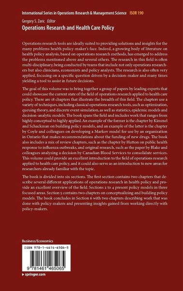 The goal of this volume was to bring together a group of papers by leading experts that could showcase the current state of the field of operations research applied to health-care policy. There are 18 chapters that illustrate the breadth of this field. The chapters use a variety of techniques, including classical operations research tools, such as optimization, queuing theory, and discrete event simulation, as well as statistics, epidemic models and decision-analytic models. The book spans the field and includes work that ranges from highly conceptual to highly applied. An example of the former is the chapter by Kimmel and Schackman on building policy models, and an example of the latter is the chapter by Coyle and colleagues on developing a Markov model for use by an organization in Ontario that makes recommendations about the funding of new drugs. The book also includes a mix of review chapters, such as the chapter by Hutton on public health response to influenza outbreaks, and original research, such as the paper by Blake and colleagues analyzing a decision by Canadian Blood Services to consolidate services. This volume could provide an excellent introduction to the field of operations research applied to health-care policy, and it could also serve as an introduction to new areas for researchers already familiarwith the topic.