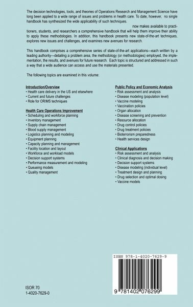 The decision technologies, tools and theories of Operations Research and Management Sciences have long been applied to a wide range of issues and problems within health care. To date, however, there has been no single handbook that synthesizes the wide applicability of such techniques. The Handbook of Operations Research and Health Care now makes available to practitioners, students, and researchers a comprehensive handbook volume that will help them improve their ability to apply these decision technologies. In addition, the handbook will present new state-of-the-art techniques, explore new issues and challenges, and examine new avenues for research. This handbook will fill these needs in a three-fold approach: It reviews health care systems (in the U.S., other developed countries, and developing countries), their structure, environment, and evolution. It reviews key issues, problems, and challenges experienced today and to be expected in the future. It synthesizes decision technology applications published in the last 10 years. It describes which health care delivery issues, problems, and challenges were addressed in the past, while highlighting areas for future operations research/management science work in health care. It provides a comprehensive series of state-of-the-art applications - each of which are written by a leading authority - detailing the problem area, the methodology (or methodologies) employed, the implementation, the results, and the issues/avenues raised for future research. Each topic will be structured and addressed in such a way that a wide audience will be able to access and use the materials presented. The following topics are examined in the volume: Introduction/ Overview: Health care delivery in the US and elsewhere, OR/MS in health; a 10 year overview. Health Care Operations Improvement: Scheduling and workforce planning, Inventory management, Supply chain management, Logistics planning and modeling, Equipment planning, Planning, Facility location and layout, Workforce & workload models, Decision support systems, Performance measurement & modeling, Queueing models, Quality management. Economic Analysis: Equipment evaluation & selection models, Optimal pricing and costing models, Demand forecasting and planning models, Impact of policies on health care demand, Technology assessment. Public Policy: Regional planning and network models, Access and availability population models, Technology diffusion models, Disease prevention, Health care coverage, Vaccine modeling, Organ allocation models, Disease screening, Resource allocation, Drug policies, Blood supply management policies. Clinical Applications: Risk assessment and analysis, Clinical diagnosis and decision making, Decision support systems, Disease modeling (individual level), Treatment design and planning, Drug selection models, Optimal dosing models, Vaccine models, Clinical quality. The handbook will serve a large multidisciplinary audience that includes: Decision technology practitioners, students, scientists and researchers with interest (either new interest or existing expertise) in health care, Practitioners in health sciences, health administration, public health, health care delivery, and health policy.