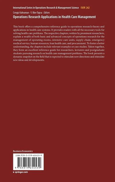 Part 1: Overview.- A Taxonomy of Operations Research Studies in Health Care Management.- A Comprehensive Survey on Health Care Management.- Part 2: Medical Units in Hospital.- The Real Time Management of Operating Rooms. Mixed fuzzy clustering for deriving predictive models in intensive care units.- Operations Research for Occupancy Modeling at Hospital Wards and its Integration into Practice.- Part 3: Care Process: Preparedness.- Evaluating Health Care System Efficiency of OECD Countries: A DEA-Based Study.- Health Care Expenditure Prediction in Turkey using Genetic Algorithm based Grey Forecasting Models.- The Impact of Social Networks in Developing and Managing Chronic Care Models.- Part 4: Care Process: Precaution.- The design and planning of organ transplantation networks.- Blood Supply Chain Management and Future Research Opportunities.- Vaccine Supply Management.- Part 5: Care Process: Diagnosis and Prognosis.- OR Applications in Disease Screening.- Classification of Cancer Data: Analyzing Gene Expression Data Using a Fuzzy Decision Tree Algorithm.- Part 6: Care Process: Treatment.- Efficiency of Diabetes Treatment: Evidence from the UK.- A Multiobjective Solution Method for Radiation Treatment Planning.- Part 7: Medical Issues.- OR Models for Emergency Medical Service (EMS) Management.- Health Informatics.- OR applications in pharmaceutical supply chain management.- A Categorical DEA Framework for Evaluating Medical Tourism Efficiency of "Top Destinations".- Part 8: Health Care Management.- Health Care Human Resource Planning.- Lean Health Care.- Procurement management in Health Care systems.