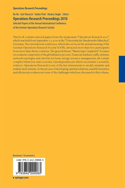 This book contains selected papers from the symposium "Operations Research 2010" which was held from September 1-3, 2010 at the "Universität der Bundeswehr München", Germany. The international conference, which also serves as the annual meeting of the German Operations Research Society (GOR), attracted more than 600 participants from more than thirty countries. The general theme "Mastering Complexity" focusses on a natural component of the globalization process. Financial markets, traffic systems, network topologies and, last but not least, energy resource management, all contain complex behaviour and economic interdependencies which necessitate a scientific solution. Operations Research is one of the key instruments to model, simulate and analyze such systems. In the process of developing optimal solutions, suitable heuristics and efficient procedures are some of the challenges which are discussed in this volume.