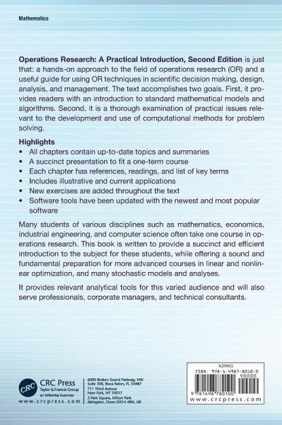Operations Research: A Practical Introduction offers a hands-on approach to the field of operations research (OR) and a useful guide for using OR techniques in scientific decision making, design, analysis and management. It provides readers with an introduction to standard mathematical models and algorithms.