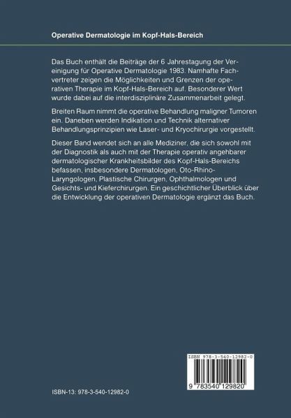 I. Historische Entwicklung der operativen Dermatologie.- Aus der Geschichte der operativen Dermatologie in den Ländern des deutschen Sprachgebietes.- II. Tumoren imKopf-Hals-Bereich.- Klinik und Diagnostik.- Semimaligne und maligne Tumoren der Haut im Kopf-Hals-Bereich.- Über die Häufigkeit und Verteilung von Basaliomen im Kopf-Hals-Bereich.- Erfassung des Wachstumsverhaltens von Basaliomen mittels klinischer und histologischer Prüfparameter und deren Analyse durch die EDV.- Melanome der Kopfregion. Klinische und histologische Besonderheiten.- Pathophysiologie der malignen Gesichts- und Skalp-Tumoren und ihre Metastasierung.- Lymphoszintigraphie: Voraussetzung für die gezielte Lymphadenektomie bei malignen Tumoren der Schleimhaut im Mundhöhlenbereich sowie der Haut an Kopf und Hals.- Abklärung großer Kopftumoren mit Hilfe der Computertomographie.- Naevi: Klinik und Histologie.- Perifollikuläre Fibrome.- Der Merkel-Zell-Tumor (Trabekuläres Karzinom) im Gesichtsbereich.- Zur Diagnose und Therapie des Merkelzell-Tumors.- Immunozytom der Haut.- Polychondritis chronica atrophieans.- Operative Techniken.- Klinik und Therapie benigner und semimaligner Tumoren im Lippenbereich.- Die chirurgische Therapie der Lippengeschwülste.- Zur Prophylaxe des Unterlippenkarzinoms.- Proliferierendes Hämangiom: bi-lobed-flap-Technik zur Defektdeckung nach Tumorexzision.- Dermatochirurgische Möglichkeiten bei epithelialen Tumoren im Nasenbereich.- Konzepte der Defektrekonstruktion nach Basaliomen im Nasenbereich.- Defektdeckung nach operativer Entfernung epithelialer Tumoren der Nase.- Lidtumoren - Probleme und operative Behandlung.- Der doppelte Schwenklappen zur Defektdeckung nach Basaliomentfernung im Augen-Nasen-Winkel.- Probleme der operativen Therapie derOhrmuschel-Malignome.- Zur Frage der Rekonstruktion und Lymphknotenausräumung bei Malignomen der Ohrmuschel.- Operative Behandlung von Naevi.- Die chirurgische Behandlung des Malignen Melanoms der Haut im Kopf-Hals-Bereich.- Indikationen zur passageren Defektdeckung mit synthetischem Hautersatz nach Tumorentfernung im Kopf-Halsbereich.- Subkutan gestielte Lappen im Gesichtsbereich.- Nahplastiken zur Behandlung von Hauttumoren im Kopf-Hals-Bereich.- Plastische Eingriffe zur Deckung runder Defekte.- Vollhauttransplantate im esichtsbereich.- Freie Hauttransplantate in der dermatologischen Praxis.- Operative Therapie von Basaliomen in der Praxis.- Die epithetische Versorgung von Gesichtsdefekten.- Lasertherapie.- Lasertherapie von nicht-vaskulären Veränderungen im Koptbereich.- Lasertherapie beim Naevus flammeus und Angiomen im Kopf-Hals-Bereich.- Der Neodym-YAG-Laser in der Therapie von Tumoren des Kopf-Hals-Bereiches.- III. Spezielletherapeutische Maßnahmen im Kopf-Hals-Bereich.- Problematik der optimalen Erstversorgung von Unfallverletzungen im Gesichtsbereich.- Verbrennungen der Kopf-Hals-Region - Aktuelles Therapiekonzept.- Dermabrasion, eine vielseitige Therapieform.- Schmutztätowierungen: Therapie und Behandlungsergebnisse.- Gegenüberstellung der Sofort- und Spätbehandlung von Schmutztätowierungen.- Die operative Entfernung von Schmucktätowierungen in der poliklinischen Sprechstunde.- Langzeitergebnisse nach operativer Rhinophym-Behandlung.- Haartransplantation - Indikation und Problematik.- Zum Problem der Hämostase bei Haartransplantationen.- Klinische Erfahrungen mit der Anwendung eines injizierbaren Kollagens im Gesichtsbereich.- Erfahrungen bei der Beseitigung von Närbchen mit injizierbarem Collagen (Zyderm).- Kryochirurgie bei dem Erythematodeschronicus discoides.