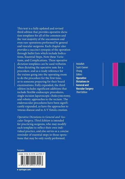This text is a fully updated and revised third edition of a highly successful text. The format of this text is unique and has been very successful. A total of 286 short chapters organized into 24 Sections provide operative dictation templates for all of the common and the vast majority of the uncommon and even rare operations performed by general and vascular surgeons. Each chapter also provides a succinct synopsis of the operation through bullet-ed lists which include Indications, Essential Steps, Note these Variations, and Complications. The book thus serves two purposes: these operative dictation templates can be used verbatim when dictating the operative note for a procedure; and the book provides ready reference to the trainee going into the operating room to do the procedure for the first time, or to someone preparing for their Board examinations. Space for notes allows surgeons to personalize the book and turn it into a resource unique to their situation. Fully updated and expanded, Operative Dictations in General and Vascular Surgery, Third Edition includes significant additions that include flexible endoscopic procedures (now recognized as a core part of general surgery training and practice), single incision laparoscopic cholecystectomy, and robotic approaches to the rectum. The endovascular procedures have been significantly expanded, as have the approaches to venous disease and to A-V fistula creation. Operative Dictations in General and Vascular Surgery, Third Edition is intended for practicing surgeons, who may modify each template to reflect their own individual practice. It also serves as a concise reminder of essential steps in those operations that may be only rarely performed.