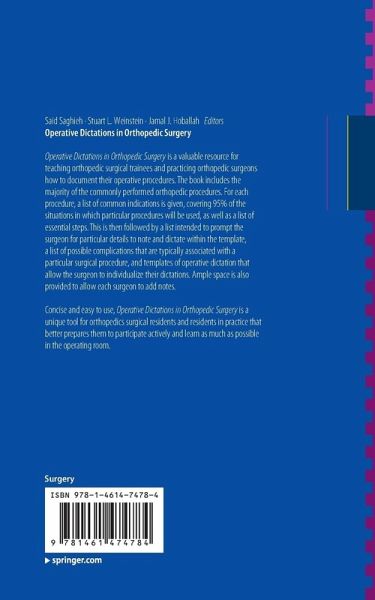Concise and easy to use, Operative Dictations in Orthopedic Surgery is a unique tool for orthopedics surgical residents and residents in practice that better prepares them to participate actively and learn as much as possible in the operating room.