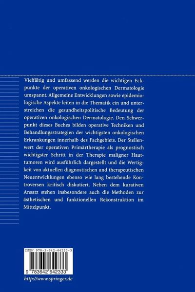 I. Entwicklungen der operativen Dermatologie.- Markierungspunkte in der Entwicklung der operativen Dermatologie zwischen 1890 und 1990.- Operative onkologische Dermatologie: Ein Blick über nationale Grenzen.- Stellenwert und Perspektiven der operativen Dermatologie im Großklinikum.- II. Epidemiologie und Prävention.- Die Prävention des Malignen Melanoms: Beispiele aus Australien und Deutschland.- Melanom-Screening in Sachsen: Erfahrungen und Ergebnisse.- Inzidenzentwicklung des malignen Melanoms: Aktuelle Daten der Region Kassel.- Epidemiologische Daten zum Berufs- und Freizeitverhalten von Melanompatienten.- Maligne Melanome in Kindheit und Jugend.- Patient "Medizinische Datenanalyse".- III.Perioperative Aspekte.- Aufklärung und haftungsrechtliche Fragen: Aktuelle Aspekte.- Operationsvorbereitung, allgemeine und spezifisch präventive Maßnahmen.- Lokalanästhesie, Regionalanästhesie, Tumeszenzanästhesie: Techniken und Indikationen.- Tumeszenz-Lokalanästhesie: Einsatz im Kopfbereich.- Leitungsblockaden im Gesichtsbereich.- IV.Operative Standards und Neuentwicklungen.- Bedeutung ästhetischer Regionen für die Rekonstruktion von Tumorexzisionsdefekten-Leitstrukturen bei lokalen Lappenplastiken.- Transpositionslappenplastiken: Techniken und Modifikationen.- Rekonstruktion der Oberlippe durch Nahlappenplastiken.- Die Deckung von Hautdefekten an der Nase mit dem Kaskadenlappen nach Emmett.- Adjuvante Verfahren in der Rekonstruktion: Hautexpander und E.T.E.-System.- Vollhaut-, Spalthaut-, Mesh-Transplantate: Techniken und Modifikationen.- V.Epitheliale Tumoren der Haut.- Die "Doppelte Flunder" zur Aufarbeitung größerer Tumorexzisate in Kryostattechnik.- Sicherheitsabstände bei Exzision von malignen epithelialen Hauttumoren.- Klinische und histologischeMerkmale kutaner Plattenepithelkarzinome mit erhöhtem Metastasierungsrisiko.- Das operative Vorgehen bei Basaliomen in Problemregionen.- Operatives Vorgehen bei kutanen Plattenepithelkarzinomen in Problemregionen.- Operativ-plastische Rekonstruktion der Periorbitalregion nach Tumorentfernung.- Operative Therapie epithelialer Tumoren der Übergangsschleimhäute im Kopf-Hals-Bereich.- Operative Therapie bei Tumoren der anogenitalen Region.- VI.Malignes Melanom.- Prognosefaktoren und prognoseorientierte Therapie.- Diagnostische Exzision-therapeutische Exzision-Rekonstruktion: Vorgehen und Techniken en detail.- Der Unterschied zwischen der lokalen subklinischen Ausbreitung von lentigiösen und anderen Melanomtypen und Behandlungskonsequenzen.- Operative Therapie akraler und subungualer Melanome.- Elektive Lymphknotendissektion.- Sentinel-Lymphknoten-Dissektion.- Lymphatic Mapping und Sentinel Lymph Node Biopsy-Eine kritische Stellungnahme.- Therapeutische Lymphknotendissektion und Metastasenchirurgie beim malignen Melanom.- Zur Metastasierung und zum weiteren Verlauf des malignen Melanoms der Haut.- Erfahrungen mit Serum-SlOO in der Melanomnachsorge.- VII. Lymphome, Sarkome, Adnextumoren.- Therapiestrategien bei kutanen Lymphomen: Stellenwert operativer Maßnahmen.- Mikrographische Chirurgie bei kutanen Sarkomen.- Operative Therapie des Merkelzell-Karzinoms: Eigene Erfahrungen anhand von 15 Fällen.