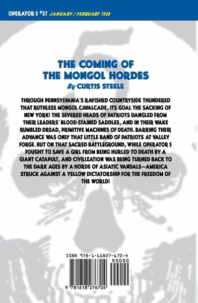 Through Pennsylvania's ravished countryside thundered that ruthless Mongol cavalcade, its goal the sacking of New York! The severed heads of patriots dangled from their leaders' blood-stained saddles, and in their wake rumbled dread, primitive machines of death. Barring their advance was only that little band of patriots at Valley Forge. But on that sacred battleground, while Operator 5 fought to save a girl from being hurled to death by a giant catapult, and civilization was being turned back to the Dark Ages by a horde of Asiatic vandals-America struck against a Yellow Dictatorship for the freedom of the world!