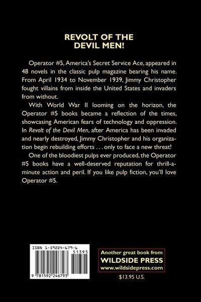 Operator #5, America's Secret Service Ace, appeared in 48 novels in the classic pulp magazine bearing his name. From April 1934 to November 1939, Jimmy Christopher fought villains from inside the United States and invaders from without. With World War II looming on the horizon, the Operator #5 books became a reflection of the times, showcasing American fears of technology and oppression. In Revolt of the Devil Men, after America has been invaded and nearly destroyed, Jimmy Christopher and his organization begin rebuilding efforts . . . only to face a new threat! One of the bloodiest pulps ever produced, the Operator #5 books have a well-deserved reputation for thrill-a-minute action and peril. If you like pulp fiction, you'll love Operator #5.
