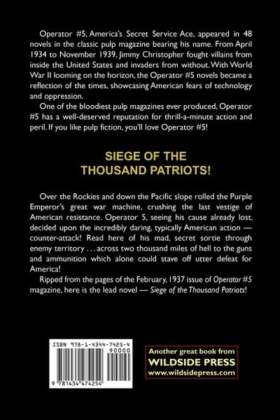 Ripped from the pages of the February, 1937 issue of "Operator #5" magazine, here is the lead novel -- "Siege of the Thousand Patriots"! Over the Rockies and down the Pacific slope rolled the Purple Emperor's great war machine, crushing the last vestige of American resistance. Operator 5, seeing his cause already lost, decided upon the incredibly daring, typically American action -- counter-attack! Read here of his mad, secret sortie through enemy territory . . . across two thousand miles of hell to the guns and ammunition which alone could stave off utter defeat for America!