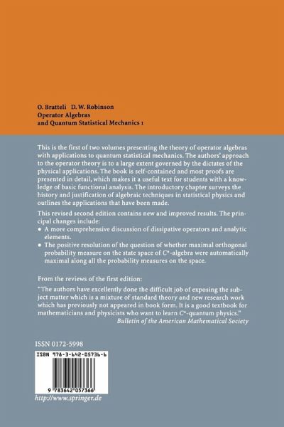 In this book we describe the elementary theory of operator algebras and parts of the advanced theory which are of relevance, or potentially of relevance, to mathematical physics. Subsequently we describe various applications to quantum statistical mechanics. At the outset of this project we intended to cover this material in one volume but in the course of develop ment it was realized that this would entail the omission ofvarious interesting topics or details. Consequently the book was split into two volumes, the first devoted to the general theory of operator algebras and the second to the applications. This splitting into theory and applications is conventional but somewhat arbitrary. In the last 15-20 years mathematical physicists have realized the importance of operator algebras and their states and automorphisms for problems of field theory and statistical mechanics. But the theory of 20 years aga was largely developed for the analysis of group representations and it was inadequate for many physical applications. Thus after a short honey moon period in which the new found tools of the extant theory were applied to the most amenable problems a longer and more interesting period ensued in which mathematical physicists were forced to redevelop the theory in relevant directions. New concepts were introduced, e. g. asymptotic abelian ness and KMS states, new techniques applied, e. g. the Choquet theory of barycentric decomposition for states, and new structural results obtained, e. g. the existence of a continuum of nonisomorphic type-three factors.