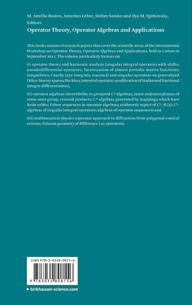 This book consists of research papers that cover the scientific areas of the International Workshop on Operator Theory, Operator Algebras and Applications, held in Lisbon in September 2012. The volume particularly focuses on (i) operator theory and harmonic analysis (singular integral operators with shifts; pseudodifferential operators, factorization of almost periodic matrix functions; inequalities; Cauchy type integrals; maximal and singular operators on generalized Orlicz-Morrey spaces; the Riesz potential operator; modification of Hadamard fractional integro-differentiation), (ii) operator algebras (invertibility in groupoid C_-algebras; inner endomorphisms of some semi group, crossed products; C_-algebras generated by mappings which have finite orbits; Folner sequences in operator algebras; arithmetic aspect of C__r SL(2); C_-algebras of singular integral operators; algebras of operator sequences) and (iii) mathematical physics (operator approach to diffraction from polygonal-conical screens; Poisson geometry of difference Lax operators).