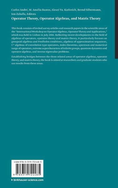 This book consists of invited survey articles and research papers in the scientific areas of the "International Workshop on Operator Algebras, Operator Theory and Applications," which was held in Lisbon in July 2016. Reflecting recent developments in the field of algebras of operators, operator theory and matrix theory, it particularly focuses on groupoid algebras and Fredholm conditions, algebras of approximation sequences, C_ algebras of convolution type operators, index theorems, spectrum and numerical range of operators, extreme supercharacters of infinite groups, quantum dynamics and operator algebras, and inverse eigenvalue problems.