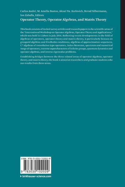 This book consists of invited survey articles and research papers in the scientific areas of the "International Workshop on Operator Algebras, Operator Theory and Applications," which was held in Lisbon in July 2016. Reflecting recent developments in the field of algebras of operators, operator theory and matrix theory, it particularly focuses on groupoid algebras and Fredholm conditions, algebras of approximation sequences, C_ algebras of convolution type operators, index theorems, spectrum and numerical range of operators, extreme supercharacters of infinite groups, quantum dynamics and operator algebras, and inverse eigenvalue problems.