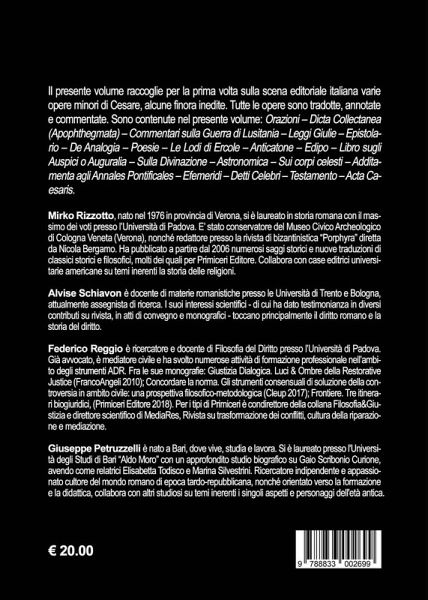Il presente volume raccoglie per la prima volta sulla scena editoriale italiana varie opere minori di Cesare, alcune finora inedite. Tutte le opere sono tradotte, annotate e commentate. Sono contenute nel presente volume: Orazioni - Dicta Collectanea (Apophthegmata) - Commentari sulla Guerra di Lusitania - Leggi Giulie - Epistolario - De Analogia - Poesie - Le Lodi di Ercole - Anticatone - Edipo - Libro sugli Auspici o Auguralia - Sulla Divinazione - Astronomica - Sui corpi celesti - Additamenta agli Annales Pontificales - Efemeridi - Detti Celebri - Testamento - Acta Caesaris