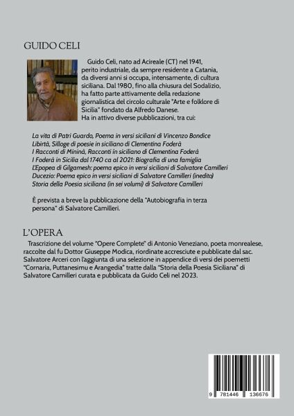Trascrizione del volume "Opere Complete" del poeta monrealese Antonio Veneziano raccolte dal fu Dottor Giuseppe Modica, riordinate, accresciute e pubblicate dal sac. Salvatore Arceri con l'aggiunta di una selezione in appendice di versi dei poemetti "Cornaria, Puttanesimu e Arangedia" tratte dalla "Storia della Poesia Siciliana" di Salvatore Camilleri curata e pubblicata da Guido Celi nel 2023.