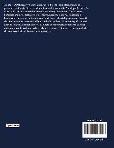 Diogene. O Polluce, i¿ vö darti un incarico. Poichè tosto ritornerai su, chè, pensomi, spetta a te di riviver dimani, se mai ti avvieni in Menippo il cinico (lo troverai in Corinto presso il Craneo, o nel Liceo, deridendo i filosofi che si bisticcian tra loro), digli così: O Menippo, Diogene ti esorta, se hai riso a bastanza delle cose della terra, a venir qui, dove riderai di più ancora. Costà il riso aveva sempre un certo dubbio, quel tale dubbio: chi sa bene quel che sarà dopo la vita? ma qui non cesserai di ridere di tutto cuore, come fo io adesso; massime quando vedrai i ricchi, i satrapi, i tiranni così miseri e trasfigurati che si riconoscono ai soli lamenti; e come son co...