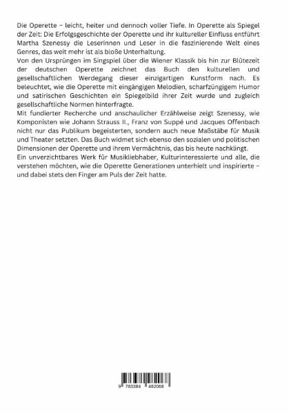 Die Operette - leicht, heiter und dennoch voller Tiefe. In Operette als Spiegel der Zeit: Die Erfolgsgeschichte der Operette und ihr kultureller Einfluss entführt Martha Szenessy die Leserinnen und Leser in die faszinierende Welt eines Genres, das weit mehr ist als bloße Unterhaltung.Von den Ursprüngen im Singspiel über die Wiener Klassik bis hin zur Blütezeit der deutschen Operette zeichnet das Buch den kulturellen und gesellschaftlichen Werdegang dieser einzigartigen Kunstform nach. Es beleuchtet, wie die Operette mit eingängigen Melodien, scharfzüngigem Humor und satirischen Geschichten ein Spiegelbild ihrer Zeit wurde und zugleich gesellschaftliche Normen hinterfragte.Mit fundierter Recherche und anschaulicher Erzählweise zeigt Szenessy, wie Komponisten wie Johann Strauss II., Franz von Suppé und Jacques Offenbach nicht nur das Publikum begeisterten, sondern auch neue Maßstäbe für Musik und Theater setzten. Das Buch widmet sich ebenso den sozialen und politischen Dimensionen der Operette und ihrem Vermächtnis, das bis heute nachklingt.Ein unverzichtbares Werk für Musikliebhaber, Kulturinteressierte und alle, die verstehen möchten, wie die Operette Generationen unterhielt und inspirierte - und dabei stets den Finger am Puls der Zeit hatte.