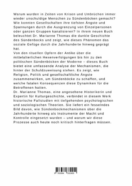 Warum wurden in Zeiten von Krisen und Umbrüchen immer wieder unschuldige Menschen zu Sündenböcken gemacht? Wie konnten Gesellschaften ihre tiefsten Ängste und Spannungen durch die Ausgrenzung von Einzelpersonen oder ganzen Gruppen kanalisieren? In ihrem neuen Buch beleuchtet Dr. Marianne Thomas die dunkle Geschichte des Sündenbocks und zeigt, wie dieses Phänomen das soziale Gefüge durch die Jahrhunderte hinweg geprägt hat.Von den rituellen Opfern der Antike über die mittelalterlichen Hexenverfolgungen bis hin zu den politischen Sündenböcken der Moderne - dieses Buch bietet eine umfassende Analyse der Mechanismen, die hinter der Schuldzuweisung stehen. Es zeigt, wie Religion, Politik und gesellschaftliche Ängste zusammenwirken, um Sündenböcke zu schaffen, und welche fatalen Konsequenzen diese Dynamiken für die Betroffenen hatten.Dr. Marianne Thomas, eine angesehene Historikerin und Expertin für Kulturgeschichte, verbindet in diesem Werk historische Fallstudien mit tiefgehenden psychologischen und soziologischen Theorien. Sie liefert ein fesselndes Bild davon, wie Sündenbockmechanismen über die Jahrhunderte hinweg als Instrumente der Macht und Kontrolle eingesetzt wurden - und warum wir diese Prozesse auch heute noch kritisch hinterfragen müssen.