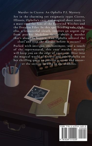 Murder in Cicero: An Ophelia P.I. Mystery Set in the charming yet enigmatic 1950s Cicero, Illinois, Ophelia's cozy and magical short story is a must-read for fans of the Eastwind Witches and the Dresden Files. In this spellbinding tale, Ophelia, a resourceful sleuth, receives an urgent tip from psychic Madeline Lewis about a murder that's about to happen. Can Ophelia unravel the clues and stop the murder before it occurs? Packed with intrigue, enchantment, and a touch of the supernatural, this cozy murder mystery will keep you on the edge of your seat. Dive into the magical world of Cicero and join Ophelia on her thrilling quest to prevent a crime and uncover the secrets lurking in the shadows.Get your copy of the first short story today and immerse yourself in a gripping tale that will leave you craving more!