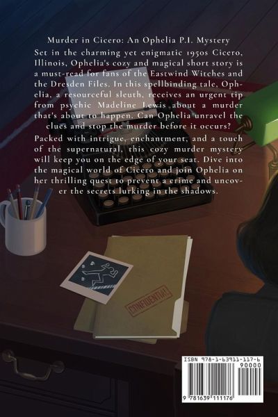 Murder in Cicero: An Ophelia P.I. Mystery Set in the charming yet enigmatic 1950s Cicero, Illinois, Ophelia's cozy and magical short story is a must-read for fans of the Eastwind Witches and the Dresden Files. In this spellbinding tale, Ophelia, a resourceful sleuth, receives an urgent tip from psychic Madeline Lewis about a murder that's about to happen. Can Ophelia unravel the clues and stop the murder before it occurs? Packed with intrigue, enchantment, and a touch of the supernatural, this cozy murder mystery will keep you on the edge of your seat. Dive into the magical world of Cicero and join Ophelia on her thrilling quest to prevent a crime and uncover the secrets lurking in the shadows.Get your copy of the first short story today and immerse yourself in a gripping tale that will leave you craving more!