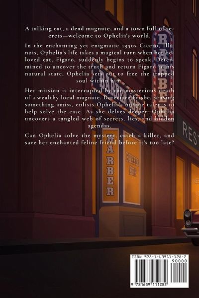 A talking cat, a dead magnate, and a town full of secrets-welcome to Ophelia's world. In the enchanting yet enigmatic 1950s Cicero, Illinois, Ophelia's life takes a magical turn when her beloved cat, Figaro, suddenly begins to speak. Determined to uncover the truth and return Figaro to his natural state, Ophelia sets out to free the trapped soul within him. Her mission is interrupted by the mysterious death of a wealthy local magnate. Detective Frisbe, sensing something amiss, enlists Ophelia's unique talents to help solve the case. As she delves deeper, Ophelia uncovers a tangled web of secrets, lies, and hidden agendas. Can Ophelia solve the mystery, catch a killer, and save her enchanted feline friend before it's too late?If you enjoy cozy mysteries with a supernatural twist like those of Agatha Christie and Shirley Jackson, you'll be captivated by Ophelia's adventures.Join Ophelia on this spellbinding journey-click "Buy Now" to unravel the mysteries of Cicero and save Figaro today!