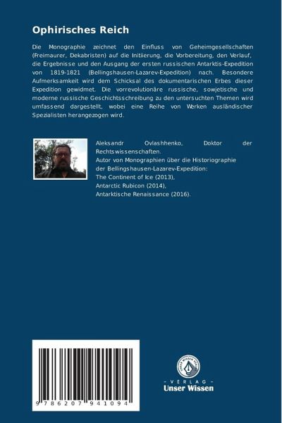Die Monographie zeichnet den Einfluss von Geheimgesellschaften (Freimaurer, Dekabristen) auf die Initiierung, die Vorbereitung, den Verlauf, die Ergebnisse und den Ausgang der ersten russischen Antarktis-Expedition von 1819-1821 (Bellingshausen-Lazarev-Expedition) nach. Besondere Aufmerksamkeit wird dem Schicksal des dokumentarischen Erbes dieser Expedition gewidmet. Die vorrevolutionäre russische, sowjetische und moderne russische Geschichtsschreibung zu den untersuchten Themen wird umfassend dargestellt, wobei eine Reihe von Werken ausländischer Spezialisten herangezogen wird.