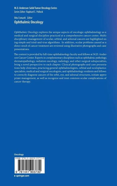 This book highlights the unique aspects of oncologic ophthalmology as a medical and surgical discipline practiced at a comprehensive cancer center. Multi-disciplinary management of ocular, orbital and adnexal cancers are highlighted using simple and tried-and-true algorithms. In addition, ocular problems caused as a direct result of cancer treatment are reviewed using illustrative photographs and case presentations. The content is provided by full-time ophthalmology faculty and fellows at M. D. Anderson Cancer Center. Experts in complementary disciplines such as ophthalmic pathology, dermatopathology, radiation oncology, radiology, and other surgical subspecialties have brought their unique perspective to each chapter.