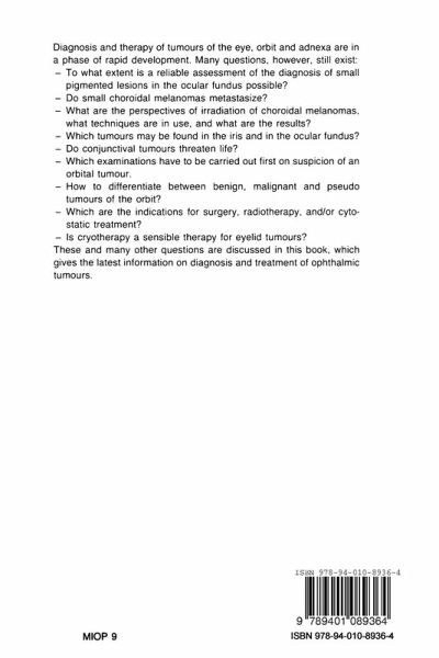 Differential diagnosis of very small melanomas and naevi of the choroid.- Five-year follow-up study of choroidal and ciliary body melanomas after enucleation.- Conservative treatment modalities of choroidal melanomas.- Treatment of intraocular melanomas by ruthenium-106 beta irradiation.- Ruthenium plaque treatment of malignant choroidal melanomas.- Cobalt plaque treatment of choroidal melanomas.- Haematoporphyrin derivative photoradiation treatment of malignant melanoma in the anterior chamber of the rabbit.- Differential diagnosis of non-pigmented intraocular tumours.- Differential diagnosis of pigmented intraocular tumours.- Retinoblastoma.- Management of conjunctival tumours.- The diagnosis and management of tumours of the iris and ciliary body.- Treatment of orbital tumours. Principles of oncological surgery.- Management of malignant orbital tumours.- Malignant ENT tumours and the orbit.- Vascular disorders in the orbit and in the orbital region.- The otorhinolaryngeal aspects of the treatment of benign orbital disorders.- Chemotherapy of orbital tumours.- Radiotherapy of tumours of the orbit and ocular adnexa.- Diagnostic features of eyelid tumours with special emphasis on epithelial tumours.- Surgery of adnexal tumours.- Liquid nitrogen cryosurgery of lid basaliomas.- List of contributors.