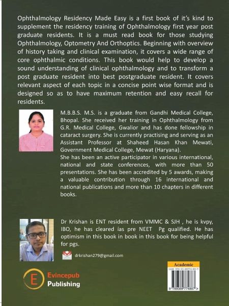 Ophthalmology is a vast and dynamic branch of medical science with advances going on every day. In this book, authors have comprehensively presented content in crisp, concise and in point wise manner. The content presentation in the form of tables, flowcharts and diagrams (A diagram is worth a thousand words) has made it easy for residents to update knowledge and refer in short time. They have discussed both general and branch specific concern of ophthalmology postgraduate residents which will definitely complement the training. Based on my residency experience, I can say that book 'Ophthalmology Residency Made Easy' will be very useful for residents. I congratulate the authors Dr Neha Adlakha, Dr Krishan Rajbhar ,contributor Dr.Krushit Patel and team of ophthalmologists for bringing such a clinically relevant book Wishing you all the best and hope that you will keep updating book with the ongoing developments in Ophthalmology.