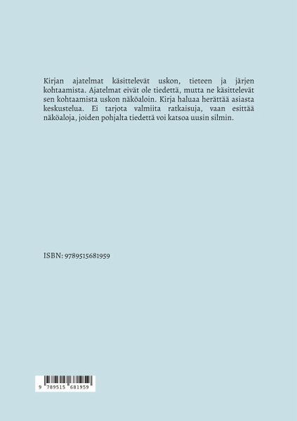 Kirjan ajatelmat käsittelevät uskon, tieteen ja järjen kohtaamista. Ajatelmat eivät ole tiedettä, mutta ne käsittelevät sen kohtaamista uskon näköaloin. Kirja haluaa herättää asiasta keskustelua. Ei tarjota valmiita ratkaisuja, vaan esittää näköaloja, joiden pohjalta tiedettä voi katsoa uusin silmin.