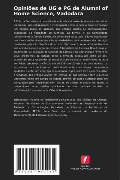A Ciência Doméstica é uma ciência aplicada e é bastante diferente de outras disciplinas; por conseguinte, o investigador sentiu a necessidade de realizar um estudo sobre as opiniões dos antigos alunos de licenciatura/pós-graduação da Faculdade de Ciências da Família e da Comunidade relativamente à Ciência Doméstica como área de estudo. São os estudantes que saem da faculdade que são os verdadeiros consumidores dos serviços prestados pelas instituições de ensino. Por isso, é importante conhecer a sua opinião sobre a área de estudo. A Faculdade de Ciências Domésticas e, atualmente, a Faculdade de Ciências da Família e da Comunidade revêem os seus programas de estudo, tanto a nível de graduação como de pós-graduação, para responder às necessidades da época. Atualmente, estão a ser feitas tentativas na Faculdade de Ciências Domésticas para equipar os estudantes para se tornarem profissionalmente mais viáveis, de modo a ajudá-los a obter um emprego remunerado. O presente livro ajudará a obter o feedback dos antigos alunos em termos da sua opinião sobre a Ciência Doméstica como um campo de estudo através do qual o currículo pode ser enriquecido pela integração com outras disciplinas e ajudar os alunos a proporcionar uma melhor qualidade de vida. Ajudará também a administração e o ensino da Ciência Doméstica.
